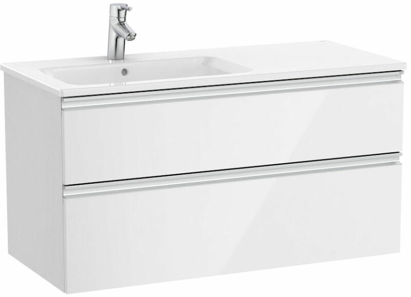 Méretek: 1005 x 460 x 537 mm 2 fiókkal és balos mosdókagylóval Fényes fehér színben