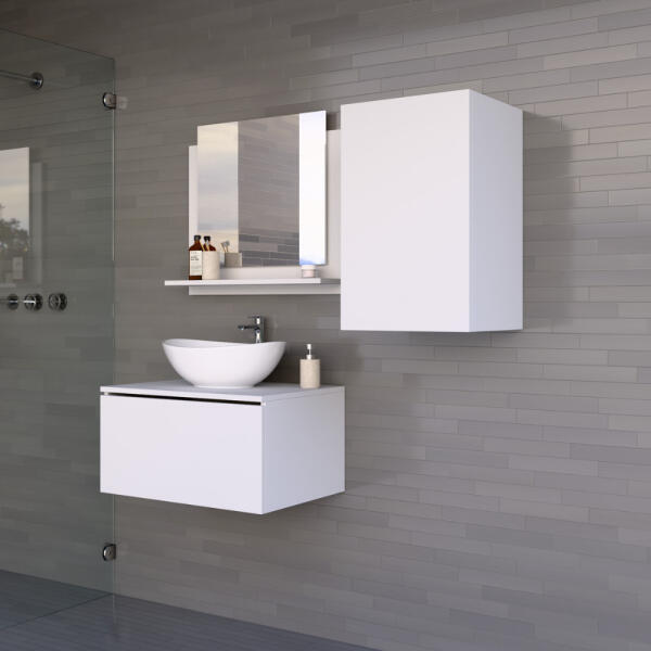 Venezia S-2 fürdőszoba bútor szett matt fehér színben. A készlet tartalmazza a mosdószekrényt, a faliszekrényt, a porcelánt mosdót szifonnal és a fali tükröt polccal. A mosdószekrény tágas helyet biztosít a tárolásra, az ajtó a felső rész enyhe megnyomásával lenyitható (push to open rendszer). 16 mm vastag bútorlapok, az élek ABS élfóliával vannak lezárva, ami egysz