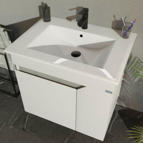 TMP VISION fali függersztett fürdőszobai bútor 60 cm A TMP VISION fali függesztett fürdőszobai bútor a modern fürdőszoba praktikus és esztétikus kiegészítője. A letisztult vonalak és a fehér színű, magasfényű felület eleganciát sugároz, miközben a falra szerelhető kialakítás helytakarékos megoldást kínál. Főbb jellemzők: Méret: 60 cm széles, ideális kisebb für
