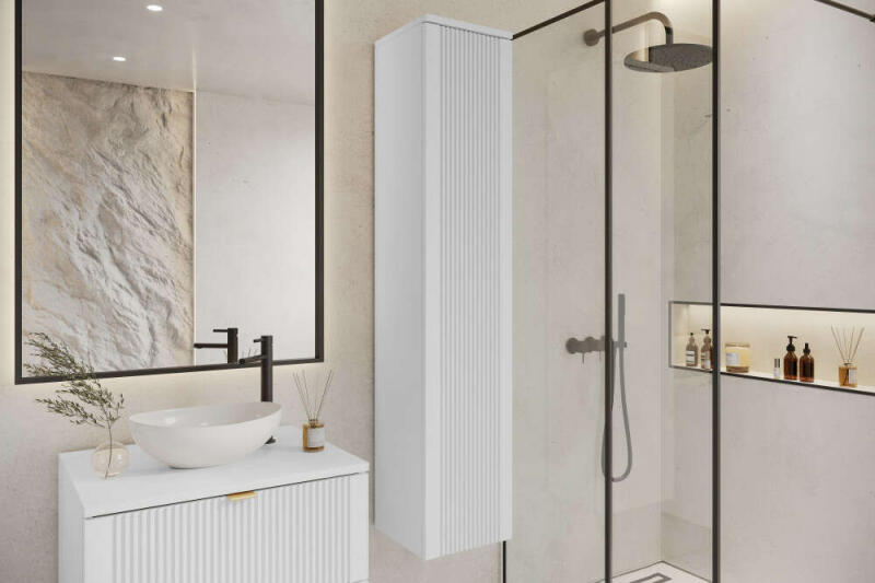 Mylife kadi függőleges fürdőszoba szekrény, matt fehér (150cm)A munkalap védve van a víz felszívódásától! ! !ELŐRENDELHETŐ!!! ELÉRHETŐ ÁPRILIS 1 TŐL!!! (házhozszállítás rendeléstől számítva 12-14 munkanap) Műszaki adatok Függőleges szekrény:- Szélesség (30cm)- Magasság: (150cm)- Mélység: (30cm)- Testszín: matt fehér- Az előlapok színezése: MDF hornyolt feh