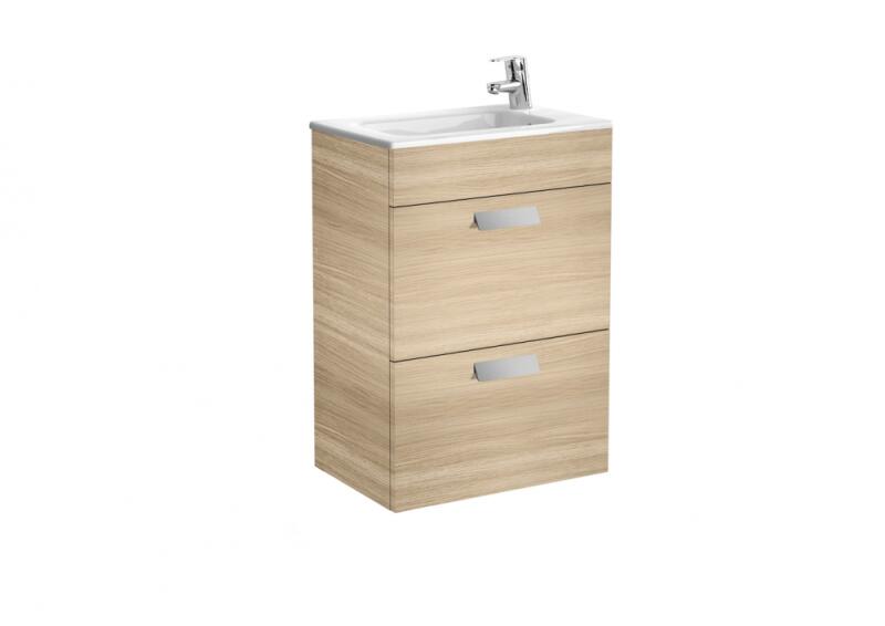 Roca Debba Unik Compact alsószekrény mosdóval, tölgy A855904155 Méret: 50x36x72 cm 2 fékezett záródású fiók Kerámia mosdó, egy csaplyukkal a jobb oldalon Opcionálisan rendelhető: bútorláb, törölközőtartó Csaptelep és leeresztő nélkül