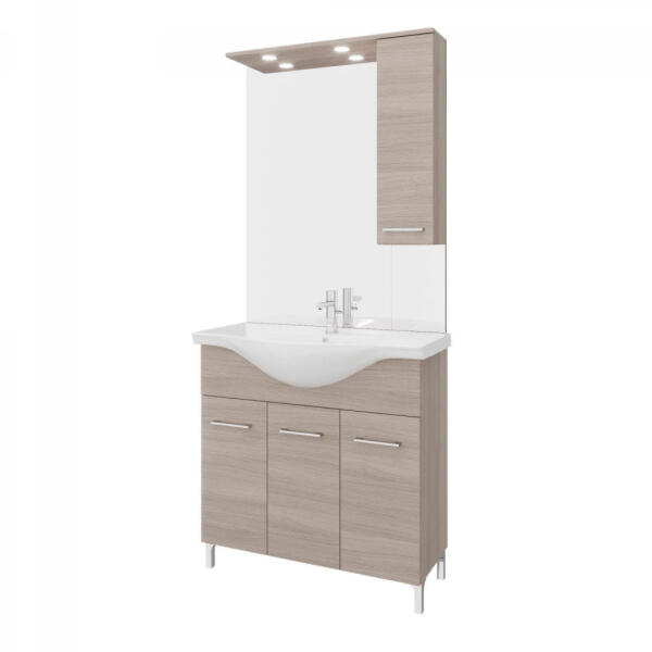 Rubino 85cm-es három ajtós fürdőszobaszekrény polccal füstölt tölgy + mosdó Rubino 85cm-es három ajtós fürdőszobaszekrény polccal füstölt tölgy + mosdó Krómozott állítható lábakkal, beépített kerámia mosdóval, csillapított záródású ajtókkal, krómozott ABS fogantyúkkal. Tükör LED lámpával, nyitható szekrénnyel. A csapot nem tartalmazza a szett! Méretek: Sz