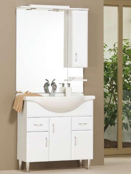 A termék ára az alsószekrényt, a mosdótálat és a felsőszekrényt tartalmazza. |Összeszerelt elemek, fényes fehér színben| A tükrös felső rész: beépített led világításal, kapcsolóval és földelt dugaljjal kialakítva |Jobbos felső szekrénnyel ( Ha szemben állunk a szekrénnyel akkor a jobb kezünk felé esik a felső szekrény) | Egyéb tulajdonságok: Fém fogantyú, fém