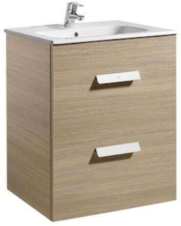 Roca Pack Debba 600 alsószekrény két fiókkal és mosdóval, textúrázott tölgy A855966155 Szekrény méret: 60x46x72 cm 2 darab fékezett záródású fiók Kerámia mosdó, egy csaplyukkal Fali kivitel Helytakarékos szifon Opcióként rendelhető: láb, tör&a