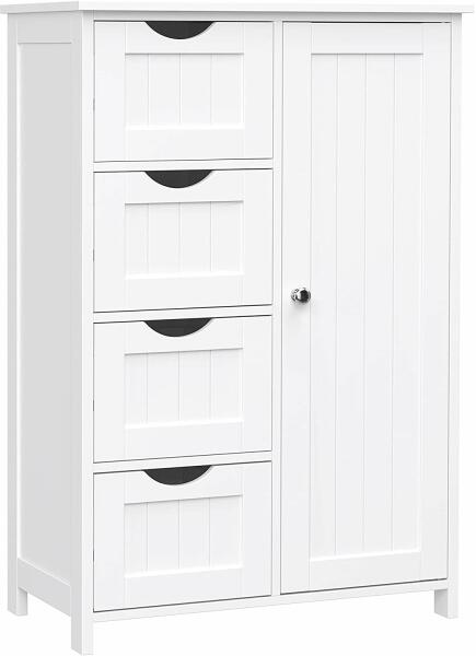 padlós fürdőszobai tárolószekrény, fa tároló egység 4 fiókkal, egyajtós, állítható polc, nappaliba, konyha, előszoba, fehér Minden ellenőrzés alatt: Törölközőre van szüksége zuhanyozás után?Kifogyott a vécépapír?Most már nem kell átszaladnia egy másik szobába, hogy megszerezze őket, mivel ez a nagy kapacitású tárolószekrény minden szükséges kelléket elfér