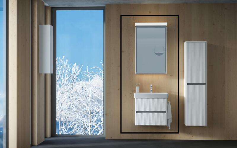 Milla 60 alsó+Roca mosdótál|Fali rögzítéssel|2 fiókos|Törölközőtartó Mara 2 db - a szekrény két oldalán|Fiókrendező: 1 db - alsó fiókba|Mirror Box Cut 55 tükrös felsőszekrény 1 ajtós balos/jobbos nyitással|1db 55cm-es LED lámpával|integrált világítás|piperetükör bal/jobb oldalt|powerbox (2 dugalj) pánttal ellentétes oldalt belül|üvegpolc|belső világítás|jel