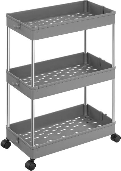 A MOBIX kerekes polc három szürke kosárral egy sokoldalú tárolási segédeszköz, amely nagyszerű lesz a fürdőszobában , a konyhában vagy a gyerekszobában . A praktikus görgőknek köszönhetően könnyen mozgatható, akár piperecikkeknek, konyhai alapanyagoknak vagy játékoknak van rá szüksége. A polcok perforált alja biztosítja, hogy a nedvesség elszálljon, és javítja a l