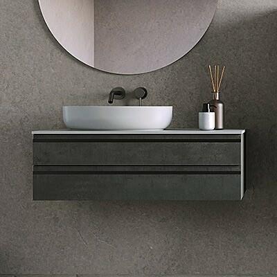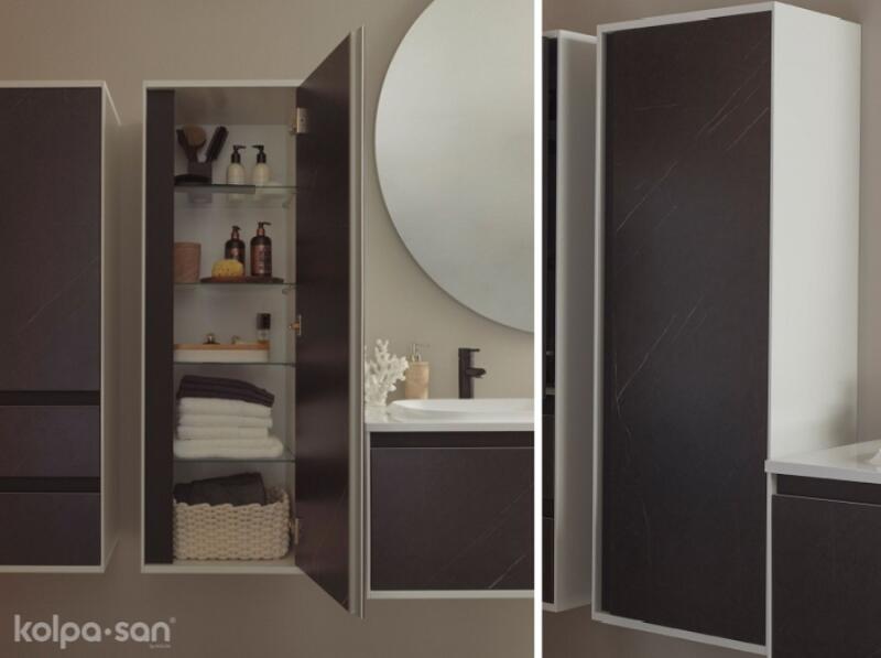 KolpaSan ALEXIS alsó szekrény, több méretben Kerrock anyagból készült pulttal, választható mosdóval. 2022-es újdonság, divatos színekben, széles méretválasztékban. Kerrock fedlappal rendelkező, fürdőszoba bútor. Rejtett bemart fogantyúkkal tervezték, fiókrendezője széria tartozék. Front: MDF nemesített 3D fóliával. Korpusz: nemesített forgácslap Fogantyúk: fekete f