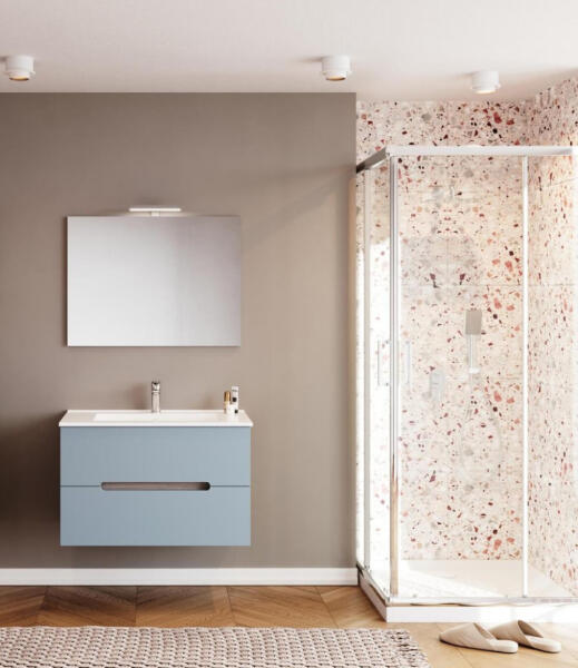 Iris 80cm-es 2 fiókos fürdőszobaszekrény pasztell kék & füstölt tölgy + mosdó Iris 80cm-es 2 fiókos fürdőszobaszekrény pasztell kék & füstölt tölgy + mosdó Kétszinű falra rögzíthető, laminált bútorlap fürdőszobabútor mart, fóliázott MDF előlappal. Csillapított záródású fiókok, ABS élzárás, beépített kerámia mosdóval. Tükör LED lámpával. A csa