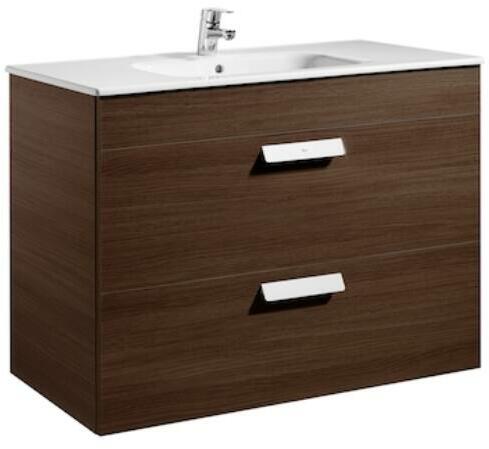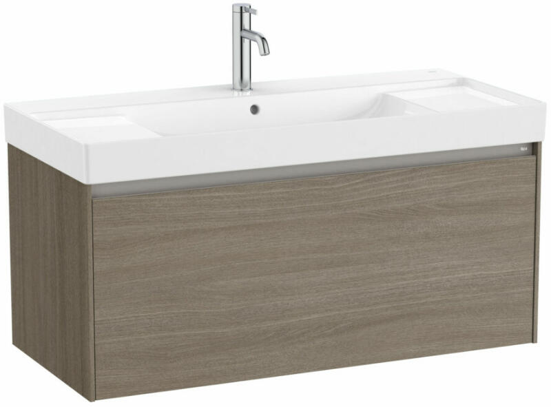 Roca Debba Unik Standard 1000 alsószekrény két fiókkal és mosdóval, textúrázott wenge A855970154 Méret: 100x46x72 cm 2 darab fékezett záródású fiók Kerámia mosdó, egy csaplyukkal Fali kivitel Helytakarékos szifon Opcióként rendelhető: láb, törölk&oum