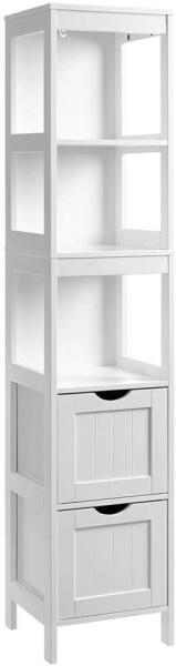 VASAGLE fürdőszobai magas szekrény, padlós tárolószekrény, 2 fiókkal és 3 nyitott polccal, 30 x 30 x 141,5 cm, fürdőszobához, nappalihoz, konyhához, fehér [ Kive hető fiókok ] Ennek a magas fürdőszobai szekrénynek a 2 fiókja könnyen átkapcsolható az alsó 3 nyitott rekeszben, így rugalmasabbá válik a különböző tárolási igényekhez [Hely az elrejtéshez és a megjele