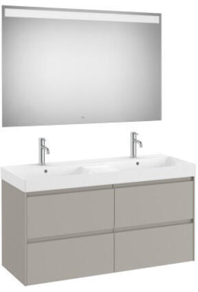 Roca Ona 4 fiókos mosdószekrény 120x46x64,5 cm kerámia mosdóval és tükör LED világítással, homokszürke A851710510 Ona termékcsalád egyszerű, mint a természet. Funkcionális anélkül, hogy hidegnek tűnne, tiszta esztétikája, amely követi a természeti környezet eredendő melegét. Azoknak készült, akik élvezik a csendes tájak erejét. Alsószekrény tulajdonságai: Gar anc