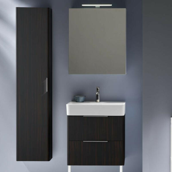 Laufen Base sötét szil alsószekrény 63,5x51,5x39,1 cm két fiókkal H4023121102631 Laufe Val H8102840001121 mosdó variációihoz Telepítés: falra Súly: 21 kg Alapanyag: forgácslap Felület: CPL fólia, ABS élek Szín: sötét szil Méret: 63,5x51,5x39,1 cm Kivitel: dupla fiók (teljesen kihúzható) Fiókok belső színe: fehér Eloxált aluínium fogantyúk Fékezett záródással (soft