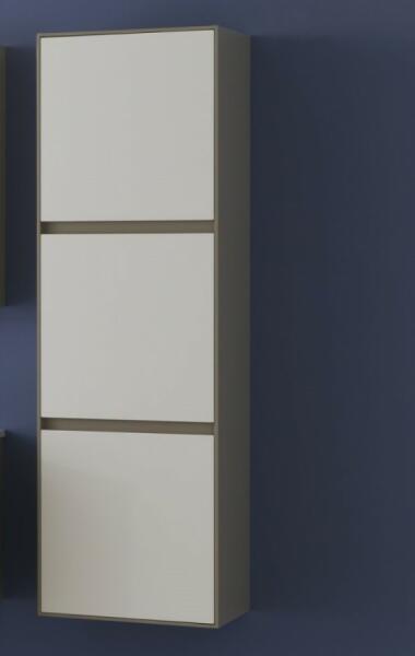 DONNA D1453 fali szekrény A Donna bútorcsalád kiegészítő fali szekrénye. Méret (széles x mély x magas): 450 x 321 x 1450 mm. 3 ajtós, üvegpolcos kivitel. Front felülete minden esetben MATT FEHÉR, a korpusz színe MATT FEKETE és MATT BEIGE színekben választható. Mindkét felület anyagát tekintve MDF. Befoglaló méret: 45. Szín: bézs/fehér.