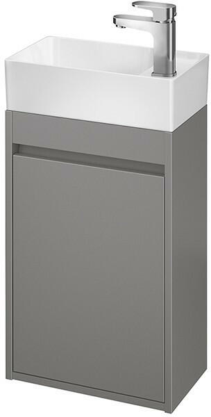Cersanit Crea 1 ajtós fali szekrény és kerámia mosdóval 40x22 cm, fényes szürke S801-281A rejtett fogantyús fiókok elülső részeit és a szekrénytestet fényes fehér lakk borítja, a mosdókagylón túlfolyó és lyuk a csap számára. A szekrény előlapja és váza nedvességálló forgácslapból készült, köszönhetően az AQUASAFE technológia használatának, amely hosszú év