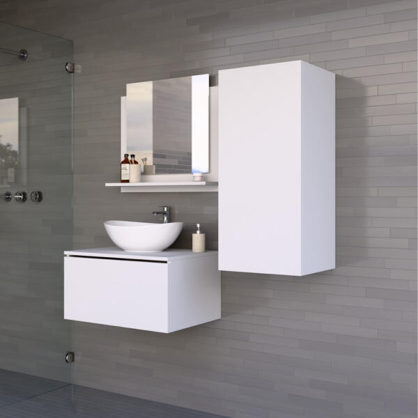 Venezia S-3 fürdőszoba bútor szett matt fehér színben. A készlet tartalmazza a mosdószekrényt, a faliszekrényt, a porcelánt mosdót szifonnal és a fali tükröt polccal. A mosdószekrény tágas helyet biztosít a tárolásra, az ajtó a felső rész enyhe megnyomásával lenyitható (push to open rendszer). 16 mm vastag bútorlapok, az élek ABS élfóliával vannak lezárva, ami egysz