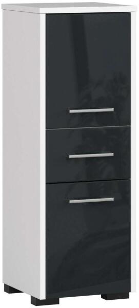 FÜRDŐSZOBA SZEKRÉNY FIN 2D 1 DB Ház fehér / Frontok grafit fényes Kopásálló, 16 mm-es laminált kartonból készült. Szélei ABS szegéllyel borítottak. Méretek: Hosszúság - 30cm Magasság - 85cm Mélység - 30cmKrémek, testápolók, gélek - ezeknek és más kozmetikumoknak, amelyeket nap mint nap használunk, a fürdőszobában van a helye. Ezek elhelyezésére érdemes beruházni