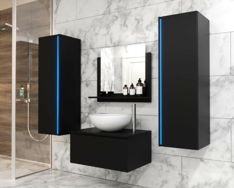 Venezia Alius A1 fürdőszoba bútor szett fekete színben. A készlet tartalmazza a mosdószekrényt, 2db faliszekrényt, a porcelánt mosdót szifonnal és a fali tükröt polccal. A mosdószekrény tágas helyet biztosít a tárolásra, az ajtó a felső rész enyhe megnyomásával lenyitható (push to open rendszer). 16 mm vastag bútorlapok, az élek ABS élfóliával vannak lezárva, ami egy