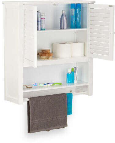 LAMELL Bambusz Fali Fürdőszoba Szekrény, Polc és Törölközőtartó Helytakarékos, falra szerelhető kivitelIntegrált törölközőszárító a polc alatti részenMágneszár. Kivehető polcokkal. Nyitott polccal és ajtókkal zárható zárt szekrénnyelFehér színre lakkozott bambuszból készült termék Mérete: 66 x 62,5 x 20 cm (Ma x Szé x Mé) Anyaga: BambuszSúlya: kb. 7,2 kg