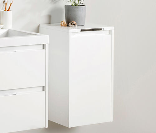 Szennyestartós fali szekrény|Méret: 35x62x35 cm (szélesség x magasság x mélység)|Szín: matt fehér|Szennyestartónak kiváló választás ez a szekrény, mert így nem kell egy más anyagból, és más stílusban készített szennyestartó kosarat betenni a fürdőszobába, teljes lesz a harmónia. |A felfelé nyíló tető bárhol megállítható, lecsukáskor pedig hangtalanul záródik