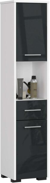 FÜRDŐSZOBA SZEKRÉNY FIN 2D 1SZ 1W Kopásálló, 16 mm-es laminált kartonból készült. Szélei ABS szegéllyel borítottak. Szín fehér, frontok grafitfényű. Méretek: Hosszúság - 30cm Magasság - 140 cm Mélység - 30cmElegáns és nagyon praktikus fürdőszobai állvány, a Krosnopan kiváló minőségű 16mm vastag laminált lapból készült. A deszka oldalait ABS-szel szegélyezték