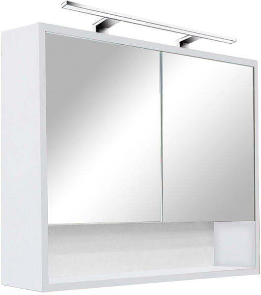 Luna 80 felső tükrös szekrény fehér Termékleírás Bút or mérete80X20X67 cmKivitel FüggesztettSzínFehérGarancia1 év A Luna 80 felső tükrös szekrény egyedivé varázsolja a fürdőszobádat! A fürdőszoba bútor tágas pakoló résszel rendelkezik ahol kényelmesen elférnek afürdőszobai pipere eszközök. A szekrényben 2 polc található. Kompakt kialakítása miatt kisebb für
