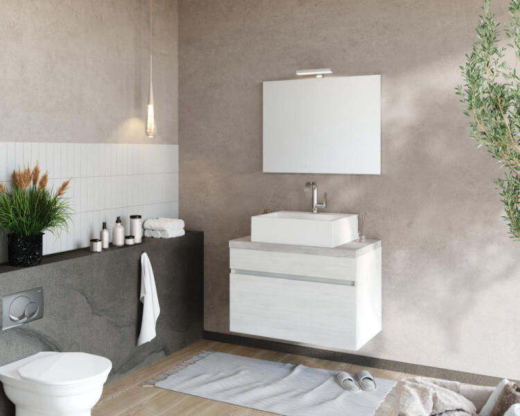Bogota 80cm-es 1 fiókos fürdőszobaszekrény fehér tölgy & beton Bogota 80cm-es 1 fiókos fürdőszobaszekrény fehér tölgy & beton Falra rögzíthető laminált bútorlap fürdőszobabútor, mosdópulttal. Csillapított záródású fiók, ABS élzárással, tükör LED lámpával. A csapot, és a mosdót nem tartalmazza a szett! Méretek: Szélesség: 80cm Magasság: 55cm Mélység
