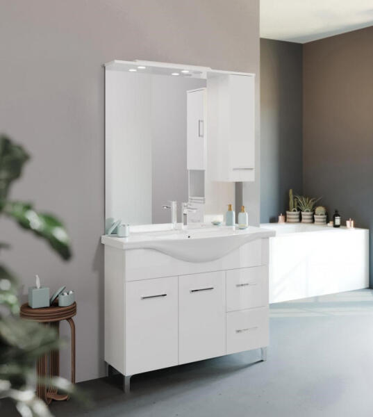 Smart 85cm-es két ajtós, két fiókos fürdőszobaszekrény, mosdóval Smart 85cm-es két ajtós, két fiókos fürdőszobaszekrény, mosdóval Fürdőszobabútor, fóliázott fényes fehér színű MDF előlappal. Krómozott állítható lábakkal, beépített kerámia mosdóval, krómozott ABS fogantyúkkal. Tükörrel, laminált bútorlap szekrénnyel. Méretek: Szélesség: 88cm Magasság:89