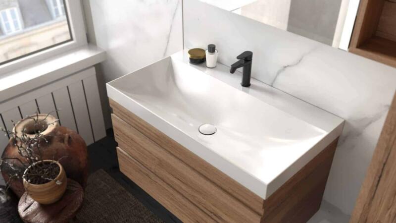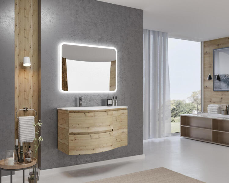 2022-es újdonság, divatos színekben, széles méretválasztékban. Kerrock fedlappal és mosdómedencékkel rendelkező, fürdőszoba bútor. Rejtett bemart fogantyúkkal tervezték, fiókrendezője széria tartozék, mosdó medencéje két féle formában választható. Újdonság továbbá a dupla kerek tükör, egy szenzoros kapcsolóval. 450X1010X320 cm Nyers fa színben!