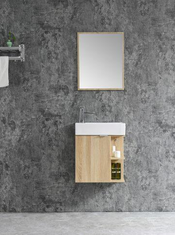 Szett tartalma: alsóbútor, mosdó, tükör|Szín: fautánzat|Bútor: MDF melaminos felület 15 mm|Előlap: MDF melaminos felület 15 mm|Tartozékok nélkül|Méret: 50 x 60 x 24 cm|anyaga: MDF, fautánzat szín|lágyan záródó mechanika|átfordítható|kerámiamosdó |színazonos, hátsó keretes tükör
