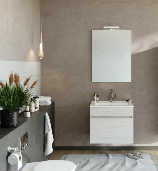 Zaffiro 60cm-es két ajtós fürdőszobaszekrény fehér tölgy + mosdó Zaffiro 60cm-es két ajtós fürdőszobaszekrény fehér tölgy + mosdó Falra rögzíthető, laminált bútorlap fürdőszobabútor, beépített kerámia mosdóval. Krómozott ABS fogantyús ajtókkal, krómozott fém törölközőtartóval. Tükör LED lámpával. Az állószekrény nem a szett része, igény esetén külö