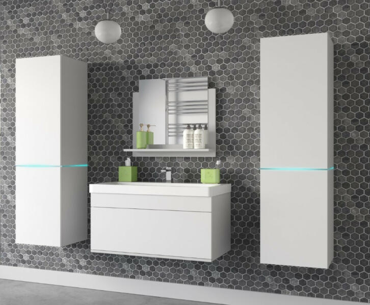 Venezia Alius-31 fürdőszobabútor szett fehér színben. A készlet tartalmaz 4db faliszekrényt, a mosdószekrényt, a porcelánt mosdókagylót szifonnal és a tükröt. A faliszekrények egymástól tetszőleges távolságra szerelhetőek, a szekrények közötti rész tökéletes helyet nyújt a tárgyak elhelyezésére. A mosdószekrény tágas helyet biztosít a tárolásra, az ajtó a fel