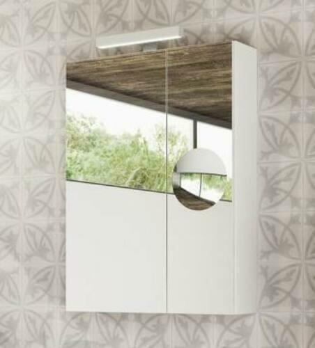 Komplett fürdőszobabútor|Szín: fényes fehér|A termék ára tartalmazza a balos felső szekrényt, az alsó szekrényt, a fali szekrényt, álló szekrényt|Felső szekrény:|Méret: 60x70x15 cm (szélesség x magasság x mélység)|Balos kivitel|A szekrényes tükörben két állítható magasságú üvegpolc található. |A tükörajtók Blum csillapítós pántokkal működnek. | Az ajtó