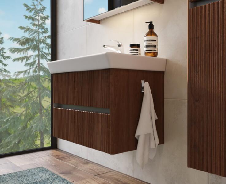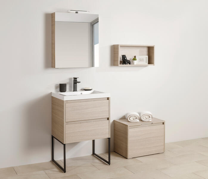 Termékjellemzők tartalmazza a következőket: mosdószekrény, alapdobozkészlet, helytakarékos szifon test alapanyaga: közepes sűrűségű farostlemez (MDF) test felületének anyaga: lakk elülső felület: kompakt laminált lap elülső rész felülete: laminált lemez (HPL) elülső keret anyaga: alumínium elülső keret anyaga: por lakk (alapszín) SmoothSurface: finom és egyenletes a