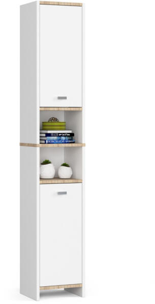 Modern, karcsú fürdőszobai állószekrény 4 praktikus polccal és 2 ajtóval, amely tökéletes tárolási megoldást kínál a kisebb fürdőszobákba. A kiváló minőségű, 16 mm-es laminált forgácslapból készült bútor ellenáll a mindennapi használatnak. Elegáns tárolási megoldás modern fürdőszobákbaA Beti fürdőszobai állószekrény tökéletes választás azoknak, akik p