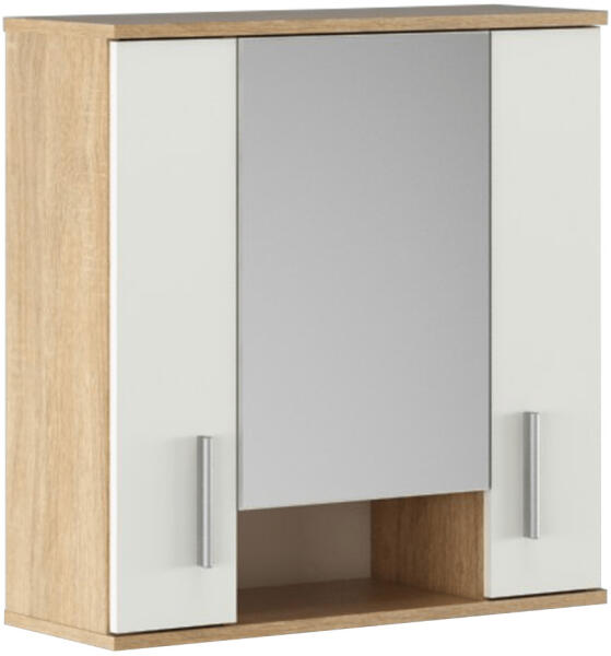 Faliszekrény tükörrel, sonoma tölgy/matt fehér, LESSY NEW 01 Fürdőszoba > Fürdőszoba bútor > Fali szekrények Anyag: laminált DTD/üveg Szín: sonoma tölgy/matt fehér Méretek (SzxMéxMa): 68,7x26x72 cm Anyag vastagsága: 1,6 cm Műanyag fogantyúk Fogantyúk színe: szürke Kétajtós Tükörrel Tükör méretei (SzxMa): 35x54,5 cm Nyitott polc Modern dizájn Szétszerelve szá