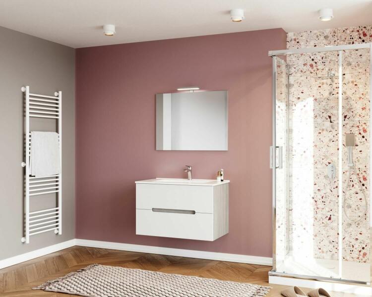 Iris 80cm-es 2 fiókos fürdőszobaszekrény matt fehér & szürke tölgy + mosdó Iris 80cm-es 2 fiókos fürdőszobaszekrény matt fehér & szürke tölgy + mosdó Kétszinű falra rögzíthető, laminált bútorlap fürdőszobabútor mart, fóliázott MDF előlappal. Csillapított záródású fiókok, ABS élzárás, beépített kerámia mosdóval. Tükör LED lámpával. A csapot nem