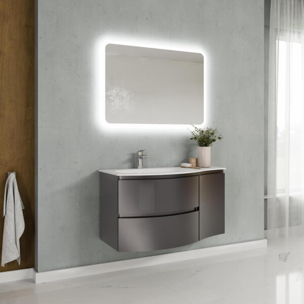 Armonia 105 cm-es fürdőszobaszekrény sötét szürke+ mosdó Armonia 105 cm-es fürdőszobaszekrény sötét szürke+ mosdó Armonia fürdőszobabútorunk az elegancia és a harmónia jegyeiben született meg. Új koncepciót nyújt ívelt és modern stílusával. A műmárvány mosdókagyló tökéletesen követi a bútor íveltségét. A fürdőszobabútor fóliázott MDF-ből készül, az aj