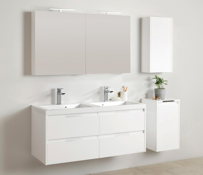 Komplett fürdőszobabútor jobbos fali szekrénnyel|A termék ára tartalmazza a felső szekrényt, az alsó szekrényt, a jobbos egyajtós fali szekrényt, a szennyestartós fali szekrényt. |Szín: fényes fehér|Felső szekrény:|Méret: 120x70x15 cm (szélesség x magasság x mélység)|A két ajtó bal, és jobb oldalra nyílik, mögötte pedig két részben van két-két tetszőlegesen áll
