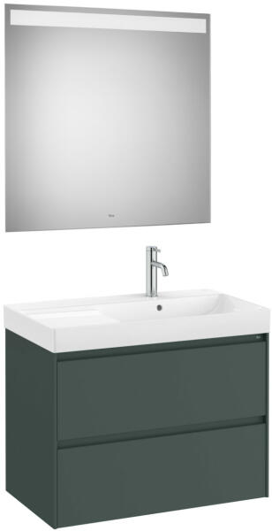 Két fiókos mosdószekrény Pack jobbos mosdóval, tükörrel|Méret: 800 x 460 x 505 mm|Szín: matt zöld|2 fiókos|A327688000 mosdóval jobboldali medencével|Tükör mérete: 800 x 800 x 22 mm|Beépített led világítással