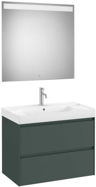 Unik mosdó+mosdószekrény Eidos tükörrel|Méret: 800 x 460 x 645 mm|Szín: matt zöld|Falra szerelhető|2 Fiókos (soft close)|1 csaplyuk középen|Tükör méret: 800 x 800x 22 mm|LED világítással