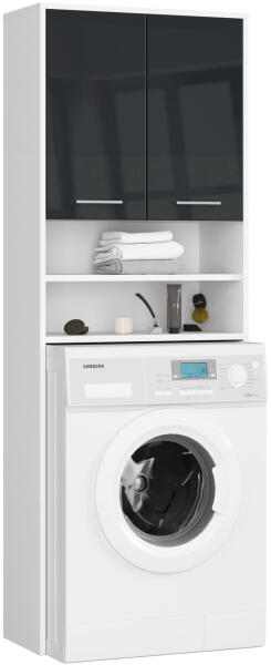 Modern, praktikus fürdőszobai szekrény mosógép fölé, amely tökéletesen ötvözi a stílust és funkcionalitást. A fehér korpusz és a magasfényű grafit ajtók elegáns kontrasztot alkotnak, miközben maximális tárolóhelyet biztosít. Maximális helykihasználás és modern design egy bútorbanEz a mosógép fölé tervezett fürdőszobai szekrény ideális megoldást kínál a korl