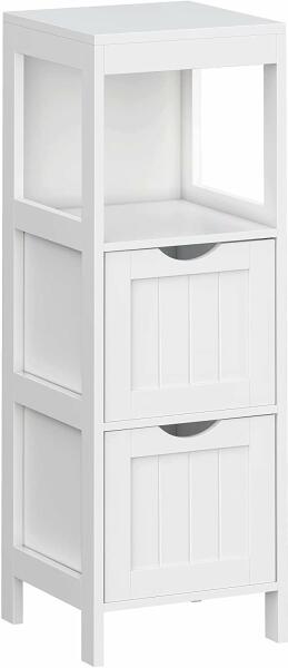 Sarok éjjeliszekrény Orvosi szekrény Fürdőszoba tároló fából készült 1 nyitott rekesz 2 fiókos láb vidéki ház stílusú fehér, MDF panelek, 30 x 89 x 30 cm Különleges kialakítás - Nagy, 360°-ban állítható ovális tükörrel, praktikusabb Elegendő hely – A komód szett 5 fiókból és egy nagy, 80 x 40 cm-es asztallapból áll, elegendő helyet biztosít a köntös elrend