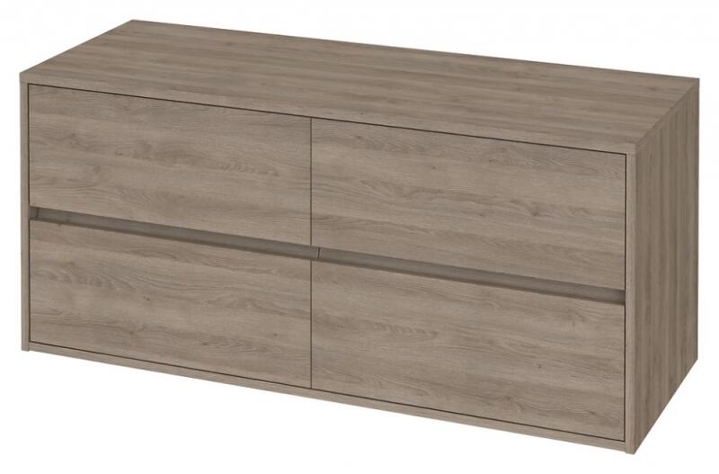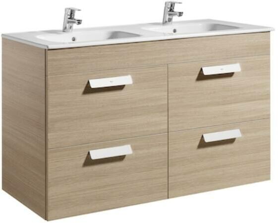 Roca Debba Unik alsószekrény négy fiókkal és dupla mosdóval, textúrázott tölgy A855971155 Méret: 120x46x72 cm 4 darab Fékezett záródású fiók Kerámia dupla mosdó, egy-egy csaplyukkal Fali kivitel 2 darab helytakarékos szifon Opcióként rendelhető: láb, tör