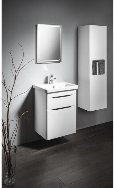 Termékjellemzők tartalmazza a következőket: mosdószekrény, alapdobozkészlet, helytakarékos szifon test alapanyaga: közepes sűrűségű farostlemez (MDF) test felületének anyaga: lakk elülső felület: üveg elülső rész felülete: fémes (szatén) elülső keret anyaga: alumínium elülső keret anyaga: por lakk (alapszín) SmoothSurface: finom és egyenletes a kellemes tapintásér