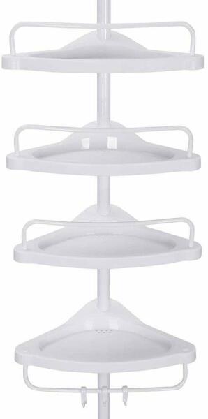 állítható fürdőszobai sarokpolc, teleszkópos zuhanykabin, 85-305 cm, padlótól a mennyezetig, 4 tálcával, 3 kampóval, fehér Kivá ló anyag: Kiváló minőségű fémcsövekből és PP műanyagból készül, porbevonattal lefedve, a csövek rozsdaállóak; megvastagodott PP műanyag tálcákkal megnő a teherbírása Jó stabilitás: A tetején lévő erős rugócső és a két oldalon