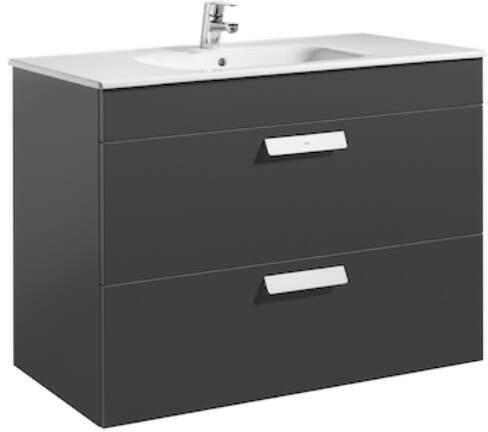 Roca Debba Unik Standard 1000 alsószekrény két fiókkal és mosdóval, antracitszürke A855970153 Méret: 100x46x72 cm 2 darab fékezett záródású fiók Kerámia mosdó, egy csaplyukkal Fali kivitel Helytakarékos szifon Opcióként rendelhető: láb, törölköző t