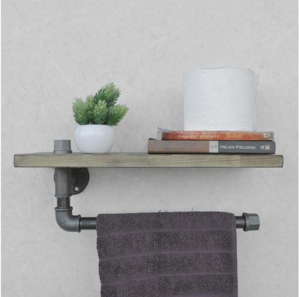 Fenyőfából készült fali polc törölközőtartóval. Modern stílusa miatt bármilyen otthonba illik. A fa és a fekete fém kombinációja ipari stílusban. Maximum terhelhetőség: 3 kg.