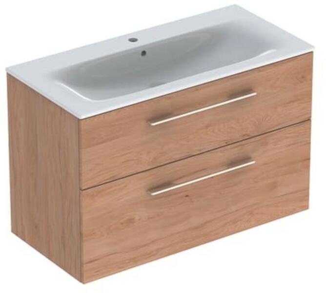 Geberit Selnova Square 2 fiókos mosdószekrény 100 cm, keskeny peremű mosdóval, világos hikoridió 501.247. 00.1 Tulajdonságok Szín: világos hikoridió Méretek: 100x65,2x50,2 cm Szélesség: 100 cm Alapanyag: szaniter kerámia Csapfurattal Túlfolyóval Falra szerelhető Keskeny perem Két fiókkal Fogantyú a nyitáshoz Fiók behúzósínnel Nagy tömörségű, háromrétegű farostlemez