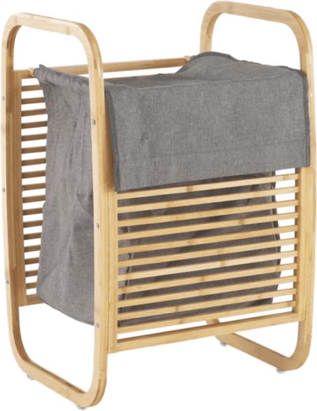Szennyeskosár, natúr bambusz/szürke, POKO praktikus szennyestartó kosár, mosható textilbetéttel, szellőző tárolórésszel. Anyaga: lakkozott bambusz + szövet. Színváltozat: natúr + szürke. (SzéxMéxMa): 40x35x60 cm. Belső méret (SzéxMéxMa): 35x30x40 cm. A belső textil kivehető és mosható 30° C-on. Fürdőszoba bútorok > Kiegészítők fürdőszobába > Szennyeskosar